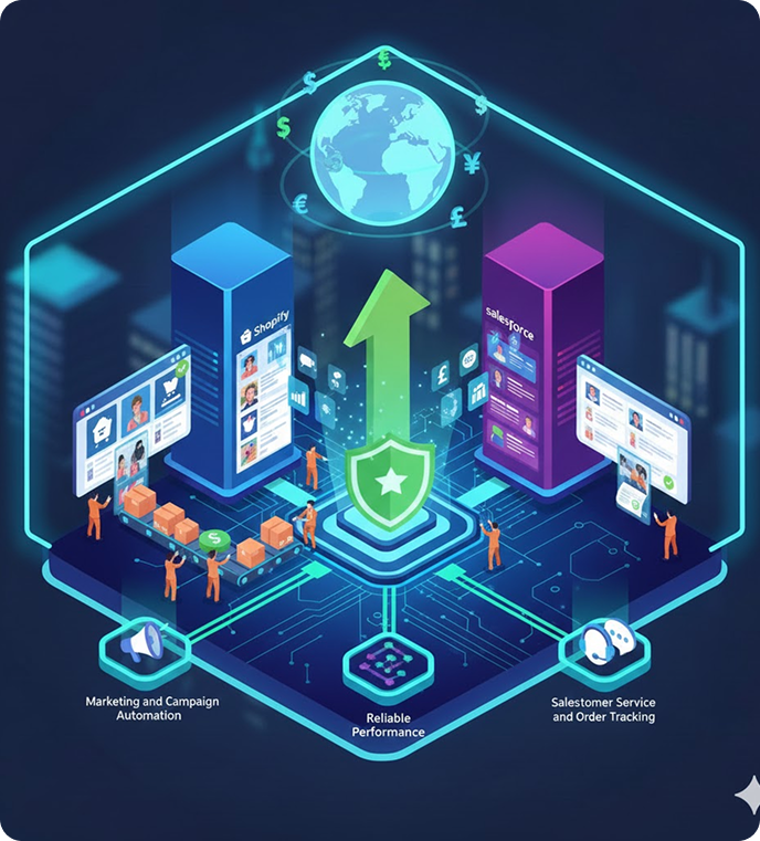 Our Shopify Salesforce integration service seamlessly connects your online store with Salesforce CRM to centralize customer data, automate workflows, and drive revenue growth. From orders and products to leads and marketing, we ensure real-time, error-free synchronization between Shopify and Salesforce. Businesses across Dubai, UAE, and the Middle East trust us to build robust Shopify CRM integrations that boost efficiency, improve customer experiences, and enable scalable growth.